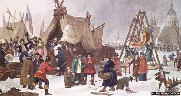 In exceptionally cold winters, especially during the ‘Little Ice age’ (thought to have lasted from about 1300 to about 1850) ‘Old Father Thames’ used to freeze solidly enough for people to walk across. Since Londoners from the year dot have loved nothing better than a party, preferably an unlicensed free-for-all, the holding of fairs on the river on such occasions became a tradition. There were Frost Fairs in 1564, 1608, 1634, 1683, 1715, 1739, and 1789, and finally, in 1814.
