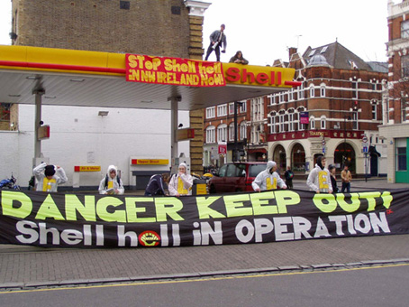 On Februry 18th 2006, activists from Rising Tide, Rhythms of Resistance and other groups shut down a Shell petrol station in sections of Upper Street in Islington, North London, for four hours, as part of an international day of action against the Rossport pipeline.