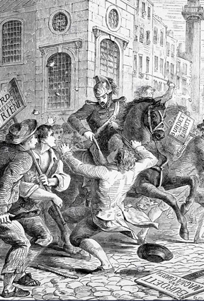 Burdett’s close friendship with William Cobbett led to his arrest in 1810. In 1809 he had been charged with a breach of privilege by the House of Commons, after his article in Cobbett’s Political Register attacked parliamentary corruption and the exclusion of reporters from debates on a controversial military expedition. Burdett was defended by Samuel Romilly. On 6 April the Commons voted to commit Burdett to the Tower of London, whereupon he challenged the speaker’s warrant and barricaded himself in his London house, refusing to allow soldiers to arrest him… Crowds surrounded his house, and rioters attacked the residences of Prime Minister Spencer Perceval and prominent Tories. After two days of rioting, armed troops were called in to London, firing on rioters on April the 8th. In the end though, Burdett backed down, and submitted to arrest. He was arrested on the morning of 9th April 1810 and was driven to the Tower of London (sparking more rioting), where he was held until the end of the parliamentary session on 21st June. The government was too afraid to expel him from Parliament. When Burdett was released, he cancelled a march through London, fearing further riots and loss of life. His biographer has argued: “Burdett’s popularity reached its peak after the incarceration; three separate biographies of him were published during that spring. But he proceeded to disappoint his followers by preventing a procession through London on his release, fearing further riots and loss of life, or that he would be assassinated.” Richard Carlile complained that “the mind of the people has marched, and Sir Francis has not been disposed to march with it”.