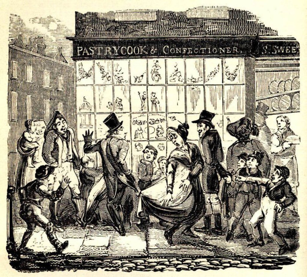 Scarcely a shop in London that offers a halfpenny plain bun to the purchase of a hungry boy, is without Twelfth-cakes and finery in the windows on Twelfth-day. The gingerbread-bakers – there are not many, compared with their number when the writer was a consumer of their manufactured goods, — even the reduced gingerbread-bakers periwig a few plum-buns with sugar-frost to-day, and coaxingly interpolate them along their new made sixes, bath-cakes, parliament, and ladies’ fingers. Their staple-ware has leaves of untarnished dutch-gilt stuck on; their upright cylinder-shaped show-glasses, containing peppermint-drops, elecampane, sugar-sticks, hard-bake, brandy-balls, and bulls’-eyes, are carefully polished; their lolly-pops are fresh encased, and look as white as the stems of tobacco-pipes; and their candlesticks are ornamented with fillets and bosses of writing paper; or, if the candles rise from the bottom of inverted glass cones, they shine more sparkling for the thorough cleaning of their receivers in the morning.