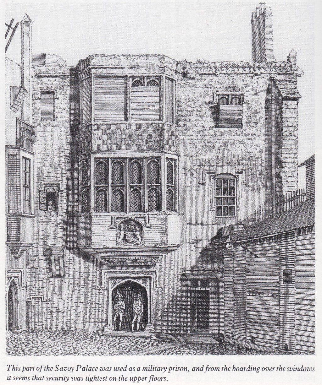 Part of the old Savoy Palace building was converted around 1679 into a barracks, which included a military prison, which particularly held any army deserters due to be shot in Hyde Park. Later the prison also seems to have been used to house civilian convicts.