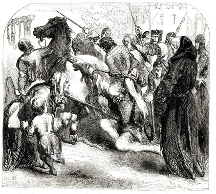 Hubert Walter saw the threat of disorder would be reduced by removing the figure at the movement’s head, and used both persuasion and threat to try to convince Londoners, including ordering the arrest of any Londoners caught outside the city (‘at Stamford Fair [March 31] some merchants… were arrested’.) But by April 1196, Walter resorted to force, after his men sent to bring FitzOsbert to trial were intimidated by the latter’s supporters. Walter sent armed men, supported by ‘noble citizens’, to arrest FitzOsbert; the latter and some of his followers fought them off, by all accounts, FitzOsbert personally killed one of the officers.