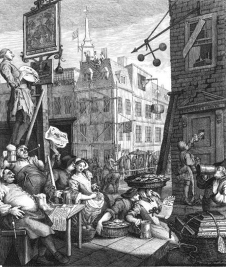 Alcohol, too, of course, is a staple part of the diet… and was considered even more so in the 1700s. Although the oft-repeated legend that ‘people in the past drank beer because water supplies were all polluted’ is not completely true, ale, and later beer, was drunk on a daily basis in great quantities. Partly because it was thought to be healthier, more nutritious than water, and people may have felt that brewing processes made it safer; also because it was generally used to lubricate and compensate for the hours of hard, low-paid work many folk did. Many workers in numerous trades were partly paid in ale or beer; this went hand in hand with the traditional use of pubs and taverns as places were people went to look for work (many trades had pubs they used as meeting points), and got paid each day, week or less often… Pubs, alehouses, inns were the one of the main centres of social life. And people like to get pissed.
