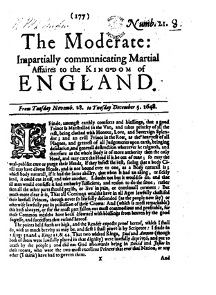 The Moderate launched in June 1648, with a format of twelve pages, much of it content being foreign news. After three issues, in July 1648, it shrank to eight pages, beginning a new series; in the sixth issue of which a regular feature was introduced, an editorial, which coincided with the paper’s becoming the mouthpiece of Leveller arguments, advocating a wider franchise and religious toleration. These arguments gained the Moderate widespread enmity; the Earl of Leicester asserted that the paper “endeavours to invite the people to overthrow all propriety, as the original cause of sin; and by that to destroy all government, magistracy, honesty, civility and humanity.” It consisted of a sheet of eight pages, small quarto size, the chief contents being the news of the day. It lasted for over a year, from July 1648 to the end of September 1649. No complete series of its numbers is extant; they are found, singly and scattered, among the collections of pamphlets of the so-called King’s or Thomason Library in the British Museum.