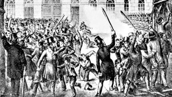 By 4pm that afternoon, the police were in control of the square. But as they withdrew two hours later, the crowd flocked back in, pulling down the wooden hoardings around Nelson’s Column and arming themselves with granite blocks from the new roads. The fighting continued until late into the evening, with parts of the crowd heading off to smash the windows of the gentlemen’s clubs in Pall Mall , breaking into bread shops to seize loaves and – shortly after midnight – moving into Grosvenor Square .