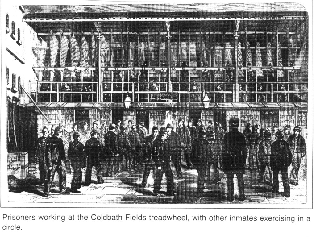 Work was considered entirely as punishment, with no educational or useful effects, and for this purpose the treadmill was provided; prisoners marched aimlessly round the six huge treadmills in silence, 15 minutes on and 15 minutes off. “The treadmill was a huge revolving cylinder with steps on it like the slats of a paddle wheel. Prisoners mounted the steps of the wheel, making it turn with their feet while gripping a bar to keep themselves upright. While some wheels were geared to grind corn or raise water, most, including the one at Coldbath Fields did nothing more than ‘grind the air’.