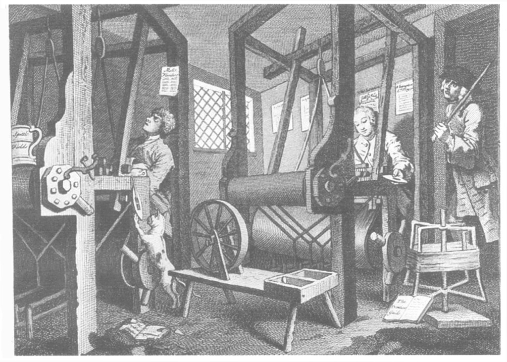 In 1763 thousands of weavers took part in wage riots & machine smashings, armed with cutlasses and disguised, destroying looms: “in riotous manner [they] broke open the house of one of their masters, destroyed his looms, and cut a great quantity of silk to pieces, after which they placed his effigy in a cart, with a halter about his neck, an executioner on one side, and a coffin on the other; and after drawing it through the streets they hanged it on a gibbet, then burnt it to ashes and afterwards dispersed.” [From the “Gentleman’s Magazine”, November 1763]