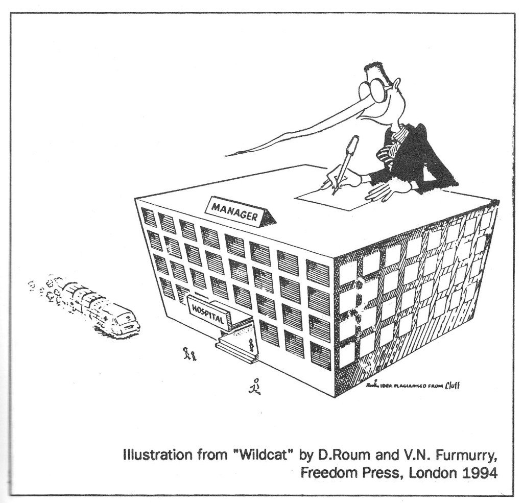 And why haven’t doctors, consultants and hospital administrators laid bare their professional unhappiness and told it like it was? This failing they share in common with most other professional people who similarly maintain a vow of silence, leaving the rest of us to try and do it for them. It is noteworthy that Dr Chris Pallis of “Solidarity” — a member of one of the best revolutionary group/mags of the 60s – never voiced his unease at being a top consultant, as though clinical practice was immune from the vicissitudes of class struggle. When he came to write on the NHS, he used it as a vehicle to demonstrate the Cardanite thesis of ever increasing bureaucracy. And where NHS staff have written from the eye of the storm it has tended to come from within a Trotskyist perspective (e.g. “Memoirs of a Callous Picket” written by Jonathan Neale, an SWP ancillary worker (Pluto Press, 1983) and Dave Widgery’s account “Some Lives” of what it was like to be a GP in a poverty stricken East London borough), Only recently have more autonomous critiques started to appear, and let’s hope we’ll see a lot more of them when things really start to come to the boil…