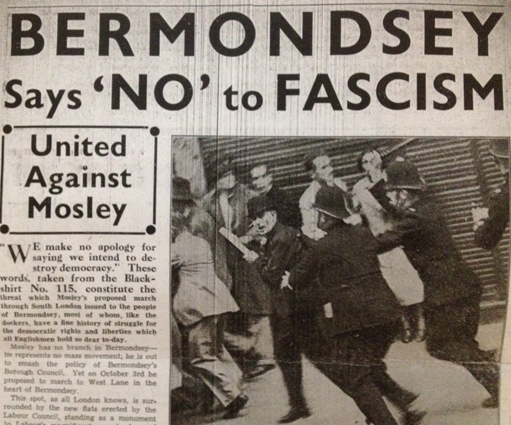 Although it’s always worth our celebrating and commemorating historical victories, we should also base our memories on what really happened and learn the lessons, and questioning the repetition of established myths. The battles of Cable Street and later of Bermondsey were important defeats for Mosley’s homegrown fascism, and physical opposition to far-right presence on the streets remains as vital now as then; from the BUF to the ‘Football Lads Alliance’ and Tommy Robinson, bopping them on the head is as crucial as arguing against their racist shite.