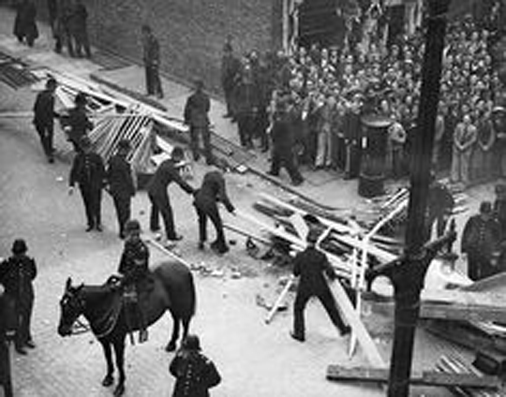 As at Cable Street, anti-fascists erected barricades: the BUF marchers were greeted in Long Lane by barriers formed from coster barrows, fencing and barbed wire, erected by the Jewish community, the Communists and many other groups whose anti fascist views poured out onto the streets. It is possible that numbers assembled he fascists surpassed those at Cable Street – some estimates run as high as 50,000 massed at Borough tube, though with true police numbering skills, Special Branch estimated around 12,000.
