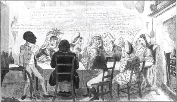 Despite being from many countries and backgrounds, divided in many ways, the London black community created not only social links but organised itself. This manifested on the various social levels which black people inhabited. Black servants certainly gathered together informally, partly to discuss information and common problems. Dr Johnson’s black servant Francis Barber was among them. A friend of Samuel Johnson’s was startled when, in the doctor’s absence, he discovered Francis Barber with ‘a group of his African countrymen . . . sitting around a fire in the gloomy anti-room; and on their all turning their sooty faces at once to stare at me, they presented a curious spectacle.’