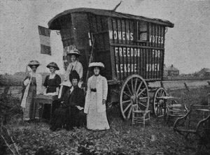 Throwing herself into campaigning for the vote, Matters travelled the south east counties of England in 1908 as “Organiser in Charge” of the first “Votes for Women” caravan, holding meetings, spreading the word and helping found WFL branches. In October 1908, she took part in a WFL protest at the Houses of Parliament, chaining herself to a grille in the Ladies Gallery of the House of Commons, while declaiming a pro-suffrage speech. As a result becoming one of the very first women to make a speech in Parliament… (if unauthorised)! She was jailed for a month in Holloway for this action. She also formed the League of Light, an organisation to support women, particularly stage actresses, who were oppressed or abused by their employers.