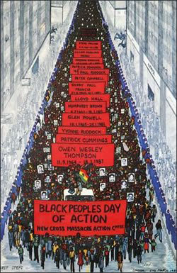 The Black People’s Day of Action saw the biggest political mobilisation of black people seen in Britain up to that point. 20,000 black people and their supporters marched over a period of eight hours from Fordham Park in New Cross, through Peckham, Elephant and Castle, across Blackfriars Bridge, into Fleet Street, Regent Street, then Cavendish Street and finally into Hyde Park, with banners and placards with slogans including: ‘Thirteen Dead and Nothing Said’, ‘No Police Cover‑Up’, ‘Blood Ah Go Run If Justice No Come’, ‘New Cross Massacre Cover Up’; ‘Forward to Freedom’, ‘Babylon will fall’; ‘No stopping us now we are on the move’; ‘No Rights, No Obligations’.