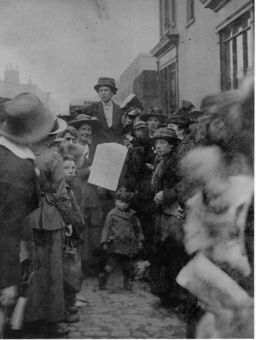 The ELFS had a strong alliance with East End socialists & workers in particular trades, especially the East End dockers. ELFS members had supported dock strikes in 1912, & the organisation continued to work closely with dockers. Many dockers wives became suffragettes. In March 1913, dockers had supported a march to Holloway, where suffragette Scott Troy was on hunger strike; Troy had organised support to help feed 1000s of dockers families during 1912 strike. ELFS had a branch which operated at the East India Dock Gate, the entrance to one of the biggest docks and a well-known speakers corner for trade unions and socialists. Every Sunday in spring & summer the ELFS staged processions that began or ended at the dock gates.
