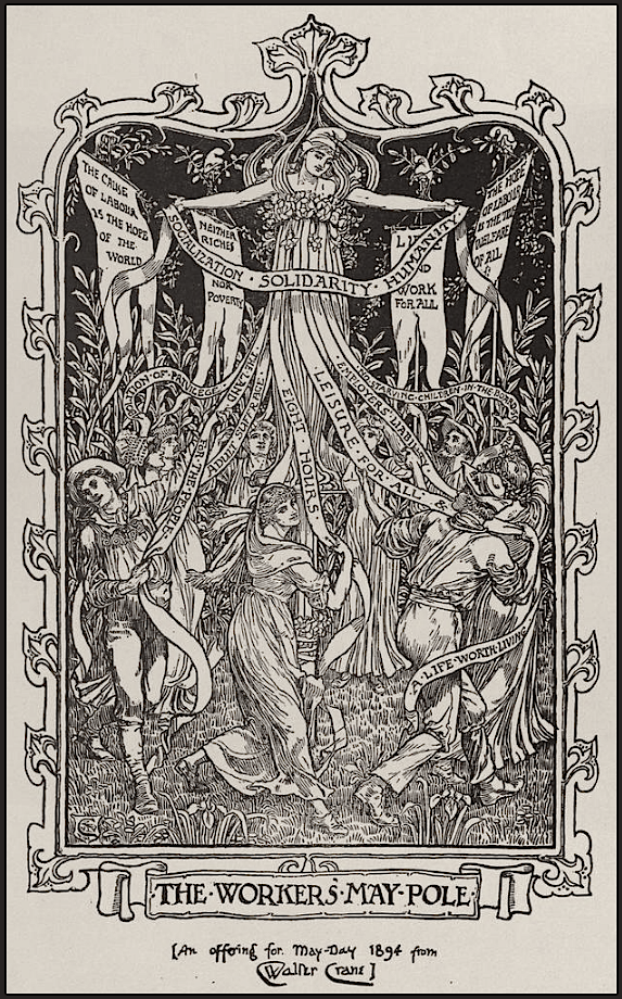 But May Day is not simply backward looking – there is an inherent optimism in celebrating the perpetual return of brighter days, and indeed of looking to children as the bearers of the future. May Day in all its guises is ‘an amorphous event within which the central themes of revival and new life have been expressed in a number of different ways’ (Judge, 1999). But more than that the idealised form of May Day festivities has offered a glimpse of a different way of life – an affirmation of the joy of living, of free time spent in the company of others in the open air, of pleasure exalted over drudgery of labour. Or as described on the ribbons of Walter Crane’s Workers Maypole, a celebration of ‘Socialication, Solidarity, Humanity’ and ‘Leisure for All’.