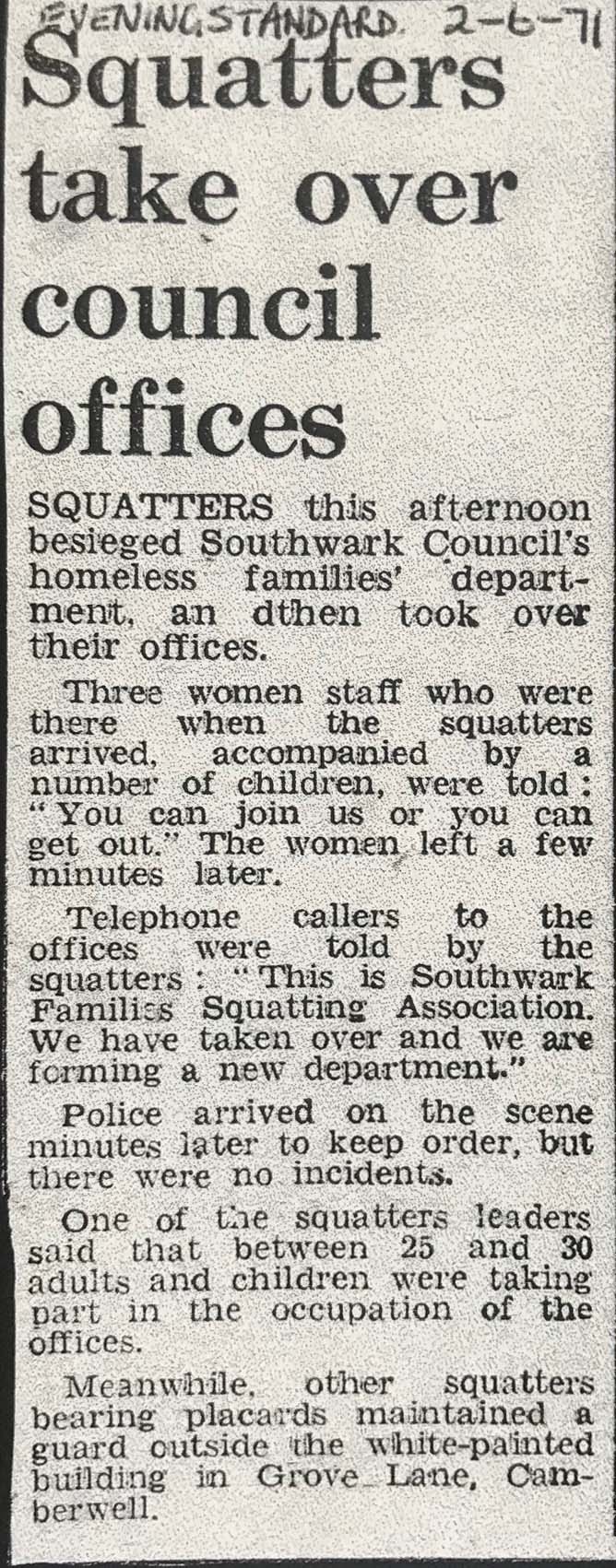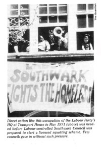 In 1974, squatters moved out of the famous Elgin Avenue in West London, were rehoused by the Greater London Council (which then owned 1000s of houses and flats all over the capital) in Rust Square, New Church Street, St George’s Way, Jardin Street and Albany Road, around the western edge of Burgess Park. 170 people were rehoused in 14 properties. These squatters had fought a long and widely publicised campaign for rehousing by the GLC, and arriving in South London, they of course got active and made links/caused trouble locally. They were still living in the houses in April 1976. At this time Kathleen Hoey and her family were squatting in Kitson Road (behind Addington Square/Rust Square). The council took them off the waiting list because they were squatting council property; however the Housing Dept were at the same time sending homeless people down to the Rust Square squatters group with letters of recommendation! A widely publicised campaign was waged on behalf of the Hoeys.