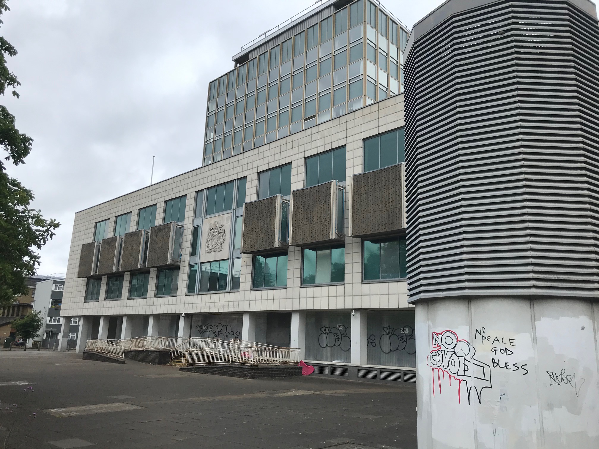 … is the old Camberwell Police Station. Closed in 2019, the building was sold off to private owners, then hilariously squatted in July 2021, by a group called Serious Annoyance, in protest at the repressive Police, Crime Sentencing and Courts bill then going through Parliament… The building was briefly used for workshops, art exhibitions run by local artists, discussions, and music sessions with the aim to transform the derelict building into a community hub and encourage community dialogue; they were evicted after a month.