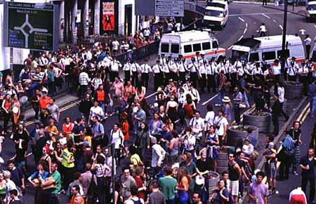 hearts we wait among the silent and formless warehouses. People are out of the trucks and lolling about in the sun. The phone rings. “Pete, it’s Des. I’ve run out of fucking petrol.” Maybe it’s right and proper that a group who claim to be against car culture should be jinxed when it comes to using them. Anyway, we’re going to have to manage the road block with just one. These problems aside, I feel surprisingly confident. It feels like some kind of miracle to be in this nowhere place waiting to pounce. If we can get this far, anything is possible. Every now and then the mobile rings. Things are OK at Liverpool Street. The crowds have started moving off and are heading towards us on the tube. And we wait. I feel like we’re on some strange island, isolated from a world we can only dream of. And then this guy wanders over, wearing a big coat and black clothes to match his long black hair. He seems vaguely pissed or stoned or both. “So, what’s happening?” “Errh… nothing much.” I sound nervous as hell. “So, what’s in the trucks?” It may have been a casual inquiry, but it’s like someone has thrown a bucket of icy water over us. I’m staring at the others and trying to look relaxed at the same time. Lee tries to shake him off, “What’s up, what you doing down here?” “Oh, my truck’s broken down. I’m parked up round the corner. Is that a sound system in the back?” Fuck. Fuck. Fuck. This is getting stranger. I’m feeling panicky again. My next words sound hollow, “Yea we’re doing a party in Hampshire tonight, should be good.” He ignores my synthetic voice and carries on, “Oh right, did you hear about the Reclaim the Streets party?” The words hang in the air like branding irons. He mutters something indiscernable and wanders off, leaving us to our paranoia. Then, as if to balance things, Des arrives. He’d managed to hitch to the petrol station and back to the car in under 20 minutes. Recent strangeness is soon forgotten as we explain the practicalities of the road-block to our new arrival. The crowd is on the way. We wait some more. The mobile rings again. It’s John. “The first tube’s gone past Marble Arch!” Now we have to move to the final pitch. It’s only just down the road, but we want to be as close as possible when the final call comes, so we can time our arrival just right. The next parkup is next to a riding school squeezed in behind a block of flats. We pull up and park in a line next to some bushes. This time there’s no lolling about, no jokes, just the weight of our nervous anticipation. If the plan goes well we shouldn’t be here for more than five minutes. The mobiles are going mad. There’s a call from Dee, her gentle nervous voice sounding strange amongst the aggressive chaos. She says there are police vans crawling all over the location, but that her group is in place. She’s part of a group of ten hiding behind a wall next to the motorway. When our cars crash, we pull the trucks up next to the wall and they all jump over, get the tripods out and put them up. We thought the police might work out where we were going by looking at the map and the direction we were heading. Our hunch was that by the time they’d worked it out we’d be too close for it to make any difference. Still, their arrival is like salt water to our already flayed nerves. In the distance we can hear police sirens above the low grumble of traffic. What is usually the slightly annoying sound of somebody else’s problem, today strikes fear into our hearts. There are probably only two or three of them, but to us it sounds like thousands. Then Clive calls. Clive is the spotter at Shepherd’s Bush, who will give us the final go ahead. He tells me that there’s a thick line of police blocking the crowd in at Shepherd’s Bush and they can’t get through onto the motorway. His words crash through me like a vandal in a greenhouse. In the background I can hear the noises of the crowd. It almost sounds like the party’s started. I tell the others, a desperate gloom envelops us, and our collective mood shifts with the speed of a retreating tide. I have spent months telling myself that even if we failed it will have been worth it. I could never have carried on if I’d thought everything hung on success. Now I see I’ve been conning myself. I feel sick. Everyone looks crushed. Jim calls. “Pete is that you?” “Yeah, fuck’s sake what’s going on.” “We can’t get through. We’re going to have to have it at Shepherd’s Bush. You’ll have to go round the back.” Even through the electronic echo I can hear the tension in his voice. He knows as well as I do that Shepherd’s Bush is a dire location. A strip of dog-shit covered lawn squeezed between two hideous shopping parades. It seems pretty unlikely that we could drive through the police cordons, and even if we could, would it be worth it? How could all those coppers get there so quickly? Why can’t the crowd break through the cordon? The hopeless, pointless, questions of loss drown out my thoughts. A mood of desolation fills me like the first cold rains of winter. It’s over. We fought the law and the law won. Sitting there in that truck in the London sunshine with those people feels like the end of hope. We start looking at the A-Z trying to work out a back route to Shepherd’s Bush. There’s no enthusiasm, this is a job now. Jen calls. She was to call if things were going badly. This call signifies a last ditch attempt to rectify things. When Clive sees there’s no way through he calls Jen. She’s waiting at the nearest station. She runs down the tube and tells people coming from Liverpool Street that there’s no way through. They then get out and approach the motorway through some back streets. “There’s a hundred or so people heading down through the back route.” By this time a small group of us are gathered round the front truck, analyzing all the information as i