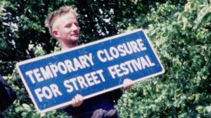 “Three thirty foot ‘pantomime dames’ glided through the party throwing confetti. Food stalls gave away free stew and sandwiches; graffiti artists added colour to the tarmac; poets ranted from the railings; acoustic bands played and strolling players performed. The tripod sitters, isolated by a police line from the party, negotiated their inclusion and joined the mass of people. The police retreated to the ends of the road settling for re-directing traffic and arguing amongst themselves.”