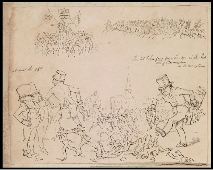 An onlooker’s cartoon of the London police attacking Chartist demonstrators in the Birmingham Bull Ring, July 1839