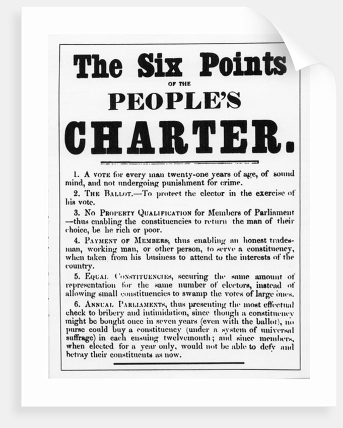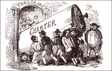 The ‘Great Reform Act’ of 1832 had, after a ferment of campaigning, given the shopkeepers and business men the vote, but given the mass of working people nothing. The Poor Law Reform of 1834, introducing imprisonment in brutal workhouses for any poor folk unable to support themselves had added insult to injury, and sparked outrage across the country. On top of this, an economic crisis hit Britain in the late 1830s, causing further poverty among already precarious industrial working lives. The anger this engendered increased the demand for political reform – the feeling that if the working class were represented in Parliament, some more attention to the misery of their lives would be forthcoming…