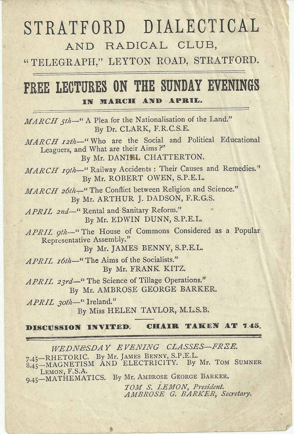 The new Stratford Dialectical and Radical Club openly adopted socialism, and Barker became their secretary. The Stratford Club was a pioneering influence in the emergence of a socialist movement from the diverse, fertile, but often politically contradictory, working men’s club and radical milieux in the 1880s. A development chronicled most analytically by Stan Shipley in his Club Life and Socialism in Mid-Victorian London.