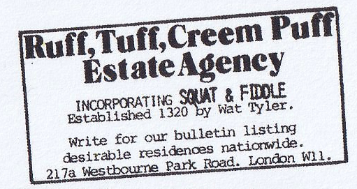 Of these, one of the earliest, operating from what for much of the decade was London’s Squat Central – West London, and especially the areas around Notting Hill and North Kensington – was the cutting edge, and sometimes notorious Ruff Tuff Creem Puff squatters estate agency. engineers, … The Ruff Tuff squatters got much information about empty properties from sympathetic telephone postal workers, council office workers as well as a British Gas official…