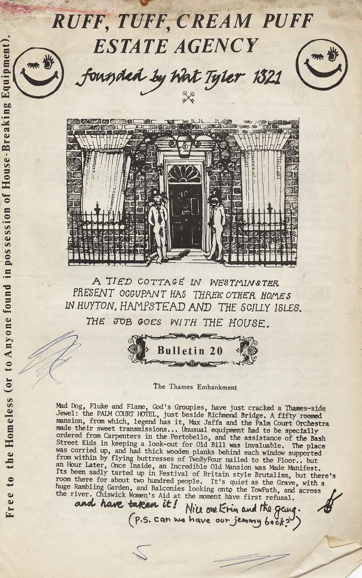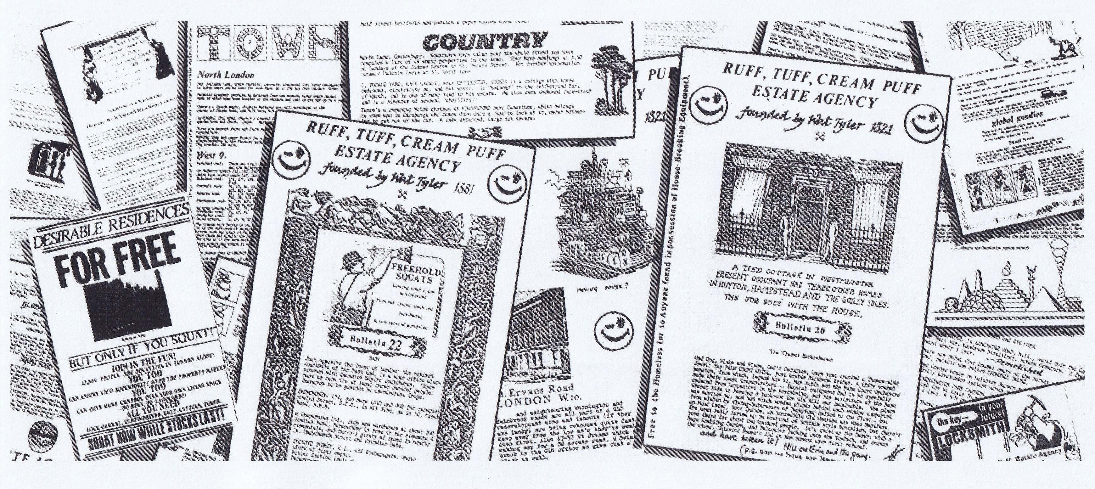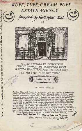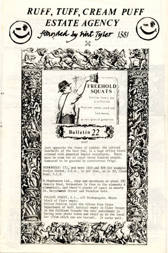A set of house-breaking equipment was purchased, and a small survey of the neighbourhood carried out. Empty properties sprang up like mushrooms and were cropped. The first bulletin advertising their availability was Gestetnered and published in an almost unreadable edition of 150 copies, and the Ruff Tuff Creem Puff Estate Agency (named after a Robert Crumb cartoon character) was registered as a working charity (Astral registration number 666).