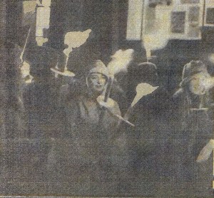 Leeds women formed a Reclaim the Night Group after reading the report of the night demos in Germany and discussing action against male violence at the “Revolutionary Feminist” con­ference in Edinburgh in July ‘77. The series of women murdered in West York­shire by the Yorkshire Ripper acted as a spur to action. Peter Sutcliffe sexually attacked and murdered thirteen women across Yorkshire between 1975 and 1980. Women in the area were angry that the police response to these murders seemed slow and that the press barely reported on them when it was mainly women involved in prostitution who were murdered. But when a young student woman was murdered, the press and the police seemed to take more notice. The police response was to tell women not to go out at night, effectively putting them under curfew. This was not a helpful suggestion for any women, those working late shifts or night shifts, or those involved in prostitution who often had no choice about whether they went out at night or not. Feminists and a variety of student and women’s groups were angered by this response and also by the sensationalising of the serial murders, which they felt hid the real fact that all too many women are affected by male violence and that this was in fact common. The Leeds Revolutionary Feminist group called for women to march in cities across the UK on the night of 12th November 1977 against rape and for a woman’s right to walk without fear at night, they advertised this in national newsletters and publicised it to women’s groups. Hundreds of women took back their cities on that night, marching with flaming torches through centres and back streets alike. They made the point that women should be able to walk anywhere and that they should not be blamed or restricted because of men’s violence.
