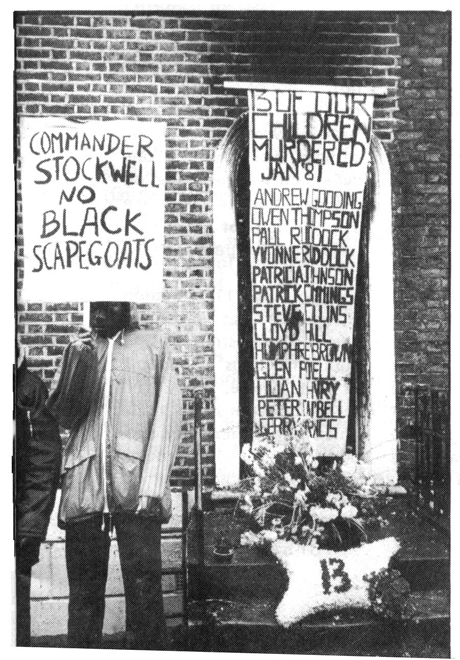 On the 18th of January 1981, 13 young black people aged 15 to 20 were killed in a fire at a birthday party at 439 New Cross Road, in New Cross, Southeast London. The police initially stated that they believed the fire was caused by a firebomb, though they later backed away from this, instead targeting black kids present at the party. The fire was widely thought to be a racist attack, and that police were covering up evidence and dragging their feet in the investigation. Family members of the dead received abusive racist letters afterwards.