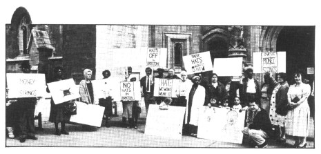 Brixton Squatters attempted to disrupt the street property selloffs, since many of their houses were being disposed of over their heads. Auctions at the Connaught Roomsj in Covent Garden leafleted, shouted down the auctioneer and informed potential buyers (including at least one Lambeth Tory councillor!) that buying houses with squatters in would be not worth their while… At one point a food fight started – bidders started throwing stuff at the squatters!
