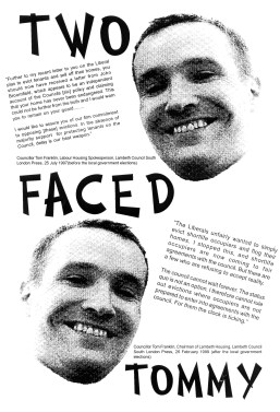 On top of the attempted decimation of squatting Lambeth also went after shortlife properties – council owned flats and houses that had been licensed or leased out (in some cases for 20 years) to housing associations, or co-ops, usually because the council didn’t have the money to do them up… Many residents had been living in these often run-down places for years, the subject of plan after plan by the Council, devised mainly to avoid recognising them as council tenants; only to be forced out when the Council decided to sell the houses off for a short-term profit. Both Liberal/Tory and Labour administrations pressed ahead with this policy, although when in opposition each tried to woo shortlife residents by denouncing the idea. Labour councillor Tom Franklin (later leader of the council) wrote to over a hundred shortlife tenanats while out of power to ‘alert’ them to