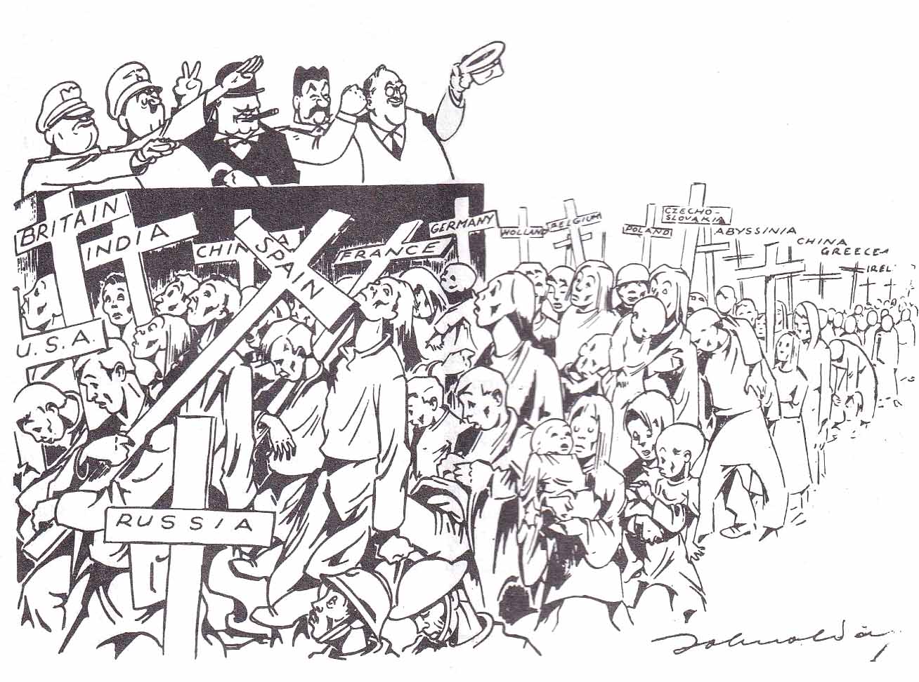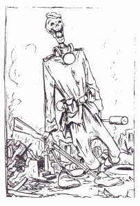 Olday’s first contribution in the February 1942 issue of War Commentary was a typical horrific, macabre, drawing, the figures were not real, they were ballet dancers, just as was the skeleton soldier in the March 1942 issue. It is really only in 1943, after he had deserted the army, that one has an awareness of the political cartoonist. I think I am right in suggesting that the inspiration, the ideas, for the outstanding cartoons and drawings in War Commentary and The March to Death from 1943 onwards came from Marie Louise Berneri. Many of his drawings illustrated editorials written by her and which she had discussed with him. She also edited a feature Through the Press and from the accumulated material came the plan for the production of John Olday’s outstanding collection of drawings, The March to Death .