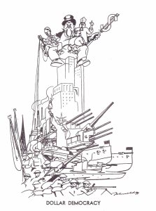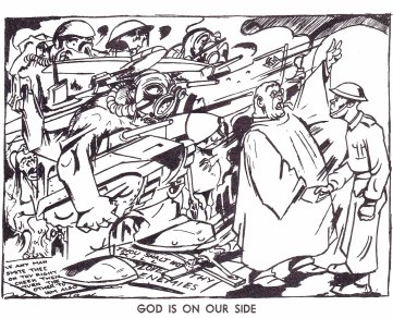 Published in May 1943 by Freedom Press in the middle of a fratricidal war, it exposed the hypocrisy of the whole enterprise by quoting from the most respectable sources (on the left hand page) and illustrating them on the facing page with John Olday’s telling cartoons. The first edition of 5,000 copies printed on our old machine in the building facing our present premises in Whitechapel was soon sold out and another 5,000 copies run off and disposed of by the end of the war. Thinking of the difficulties we have experienced since the end of World War II to persuade booksellers to stock FP literature, I am still amazed by the sales through booksellers made by our two ace ‘salesmen’, Laurie Hislam (tragically killed in a motor accident less than ten years ago) and Philip Sansom.