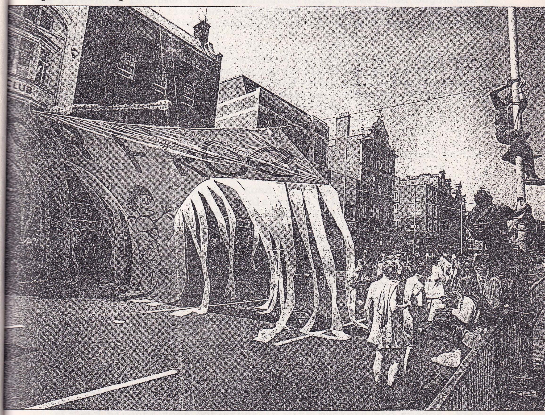 A tank painted pink and covered in anti-car banners drove up and parked in front of the station, blocking the traffic. Banners were strung between lamp posts, a mobile disco and radio station took up its position, a sandy beach was constructed and bands assembled.