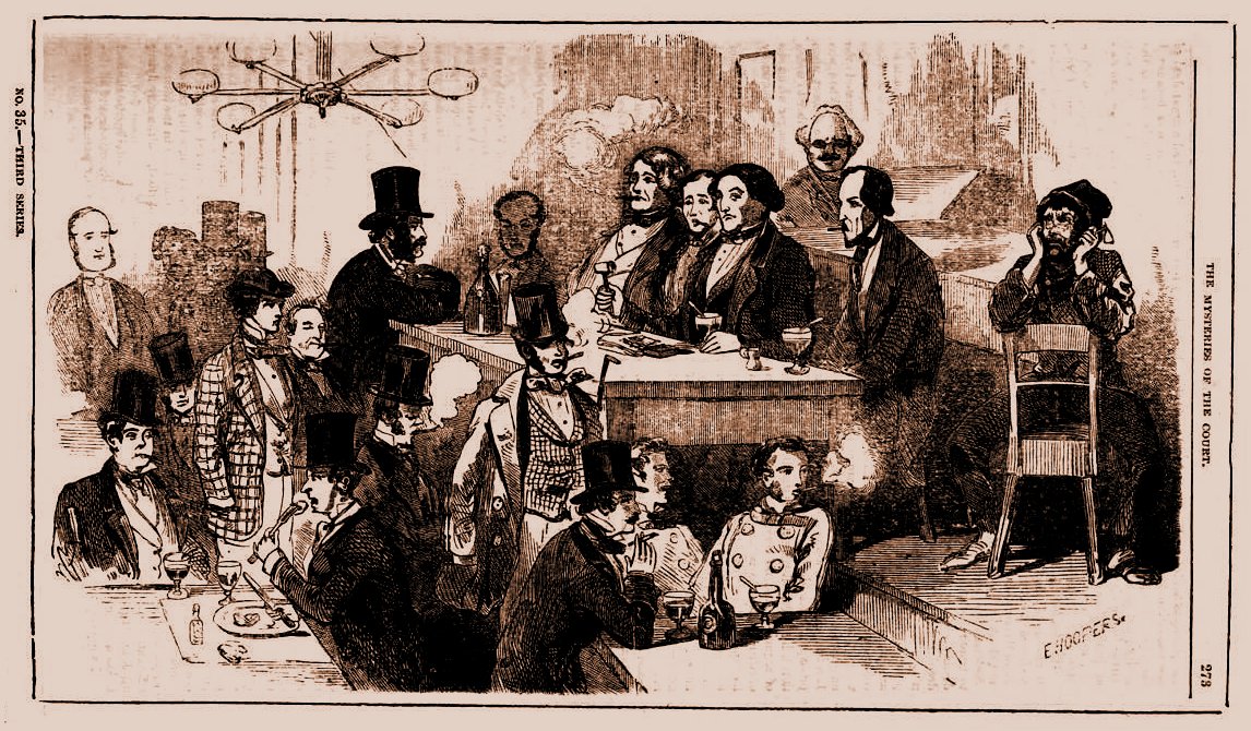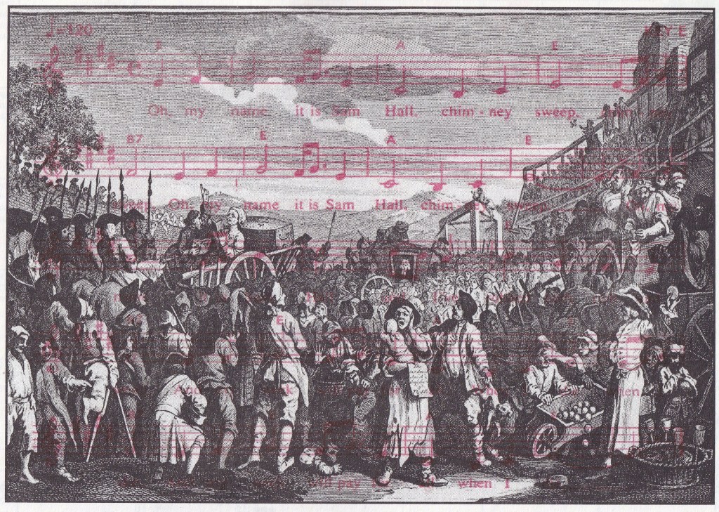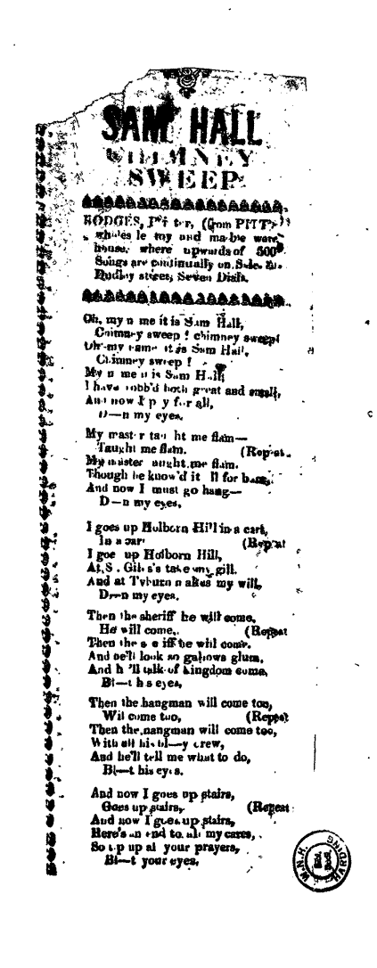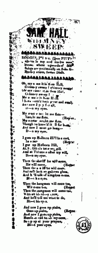 ‘After that, to supper at the Cider Cellars in Maiden Lane, wherein was much Company, great and small, and did call for Kidneys and Stout, then a small glass of Aqua-vitae and water, and thereto a Cigar. While we supped, the Singers did entertain us with Glees and comical Ditties; but oh, to hear with how little wit the young sparks about town were tickled! But the thing that did most take me was to see and hear one Ross sing the song of Sam Hall the chimney-sweep, going to be hanged: for he had begrimed his muzzle to look unshaven, and in rusty black clothes, with a battered old Hat on his crown and a short Pipe in his mouth, did sit upon the platform, leaning over the back of a chair: so making believe that he was on his way to Tyburn. And then he did sing to a dismal Psalm-tune, how that his name was Sam Hall and that he had been a great Thief, and was now about to pay for all with his life; and thereupon he swore an Oath, which did make me somewhat shiver, though divers laughed at it. Then, in so many verses, how his Master had badly taught him and now he must hang for it: how he should ride up Holborn Hill in a Cart, and the Sheriffs would come and preach to him, and after them would come the Hangman; and at the end of each verse he did repeat his Oath. Last of all, how that he should go up to the Gallows; and desired the Prayers of his Audience, and ended by cursing them all round. Methinks it had been a Sermon to a Rogue to hear him, and I wish it may have done good to some of the Company. Yet was his cursing very horrible, albeit to not a few it seemed a high Joke; but I do doubt that they understood the song.’