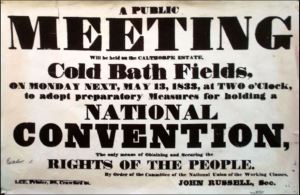 Especially after the 1832 Reform Act gave voting rights to middle class men, but not the working class, some elements of the Union came to the conclusion that the lower classes would have to rebel to obtain their ‘rights’. There was a strong sense that the middle class reformers had used the threat of working class uprising as a stick to force the aristocracy to share power with them, then shafted their proletarian allies. Benbow made a speech celebrating the great reform riot in Bristol in 1831, but was opposed by other members of the NUWC Committee… Some NUWC members made plans to arm themselves in self defence against police attacks on rallies, which jacked up the government and bourgeoisie’s fear of the Union. By 1833, the moderates were beginning to desert the NUWC and the more desperate elements came to the fore. Their plan to launch a Convention of the People (a scary notion for the upper classes, coming straight from the most radical phase of the French Revolution) led to a rally on Coldbath fields in Clerkenwell, which was kettled and attacked by police. In the fighting a policeman was killed.