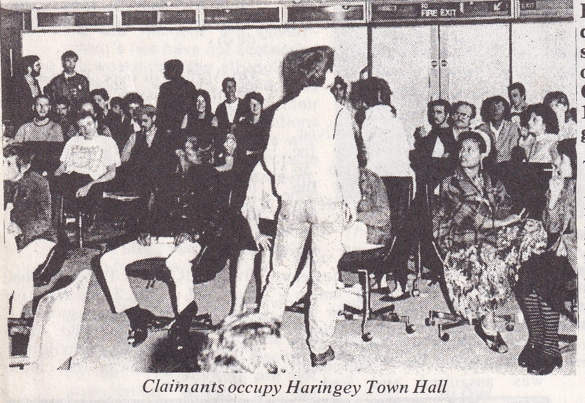 Haringey Town hall was occupied 8/5/1987 by 120 claimants organised through Tottenham Claimants Union. The Claimants Union called for claimants to rally at Haringey Civic Centre on 8th May. Some strikers supported this (after the issue was discussed all week on picket lines etc). Both the local branches of CPSA strikers and NALGO Union Town Hall workers agreed that payments should be made by the Council). Whilst local politicians came out to make speeches, 120 penniless claimants went and occupied the Council chamber.