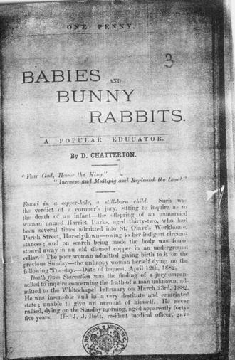Chatterton is notable also for his championing of women’s causes. He frequently referred to the thousands forced by poverty into prostitution, and consciously used the phrase `women and men’. Chatterton went out of his way to emphasise that women as well as men should work to destroy the social order and would benefit from the classless society he envisaged. His advocacy of contraception was based on the neo-Malthusian ground that smaller families would alleviate poverty, but there was also a hedonistic strand, absent in much other pioneering birth control literature, emphasising the enjoyment of sex. In 1883, a few years after the trial of Charles Bradlaugh and Annie Besant for republishing the Knowlton pamphlet on birth control, Chatterton outlined his views on family limitation in a penny pamphlet entitled Babies and Bunny Rabbits: a popular educator: