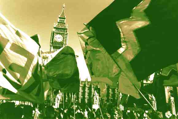 The march started at Kennington Park, and wound its way in bright sunshine over Lambeth Bridge, past the Houses of Parliament and Whitehall to Trafalgar Square where there was a rally. Most of the march took place in a carnival atmosphere, with hundreds of colourful and imaginative protest banners and flags, and much drumming, whistles and chants. The crowd was a varied mix of trade unionists, ravers, left-wing parties, anarchists and thousands of others. All through the march people handed out many different leaflets on upcoming events and protests, and alternative views – especially about the irrelevance of parliamentary politics, and about real change being made by people getting organised and trying to reclaim our lives, our streets and environment from those in power.