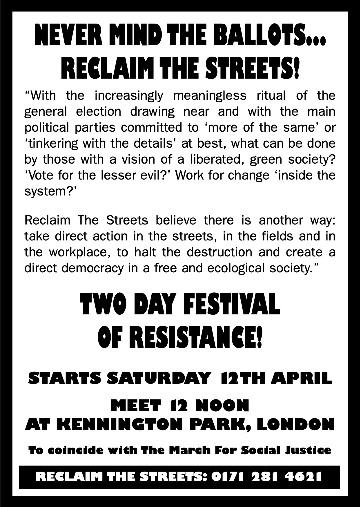 The Reclaim the Streets April ’97 party was definitely something of a break from this leftist routine, as RTS had always aspired to – break the mould.
