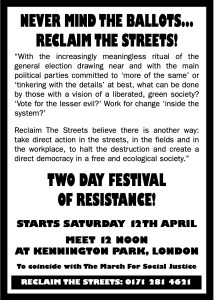 The weekend was planned to begin with the distribution of 20,000 copies of a newspaper called ‘Evading Standards’ (a spoof of the leading London newspaper, the ‘Evening Standard’) handed out free at tube stations across London during the evening rush hour. With the headline “General Election Cancelled”, the newspaper was produced as a counter voice to the mainstream media, to explain to the general public RTS vision of a world where people took back control of their lives from multinational corporations and governments, with forms of local democracy and local ecological production. It contained humorous or critical commentary along with information on a range of alternative politics and on the coming weekend’s events.